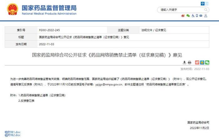 中新网11月4日电 据国家药监局网站消息,为进一步完善药品网络销售监管有关政策,明确药品网络销售范围,国家药监局组织起草了《药品网络销售禁止清单(征求意见稿)》。