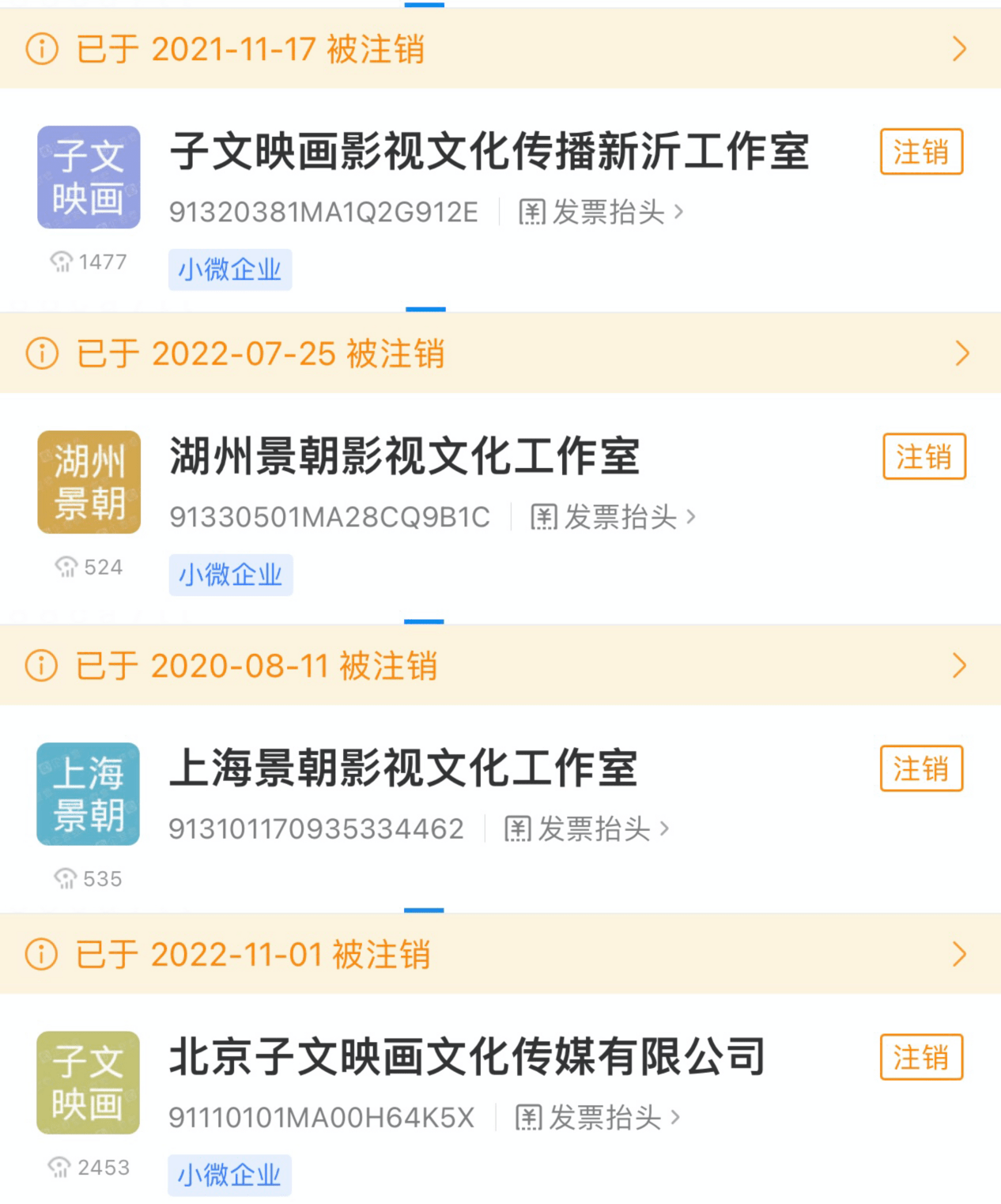 近日,企查查APP显示王子文于11月1日注销北京子文映画文化传媒有限公司,该公司成立于2017年8月16日,法定代表人为李梦颖,由艺人王子文(本名王蒙蒙)全资控股;其名下另外3家公司上海景朝影视文化工作室、湖州景朝影视文化工作室、子文映画文化传播新沂工作室也从2021年开始陆续被注销。实际上在四家公司并未全部完成注销前,王子文也成立了新的工作室,依旧全资控股100%,并非像网传所说“王子文短时间内迅速注销了名下全部持股100%的公司”。