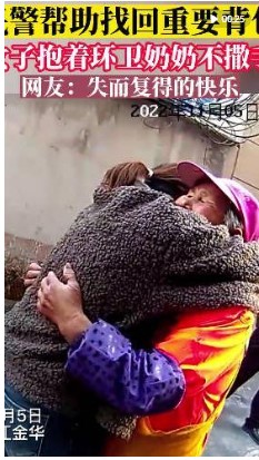 【女子紧抱帮找失物环卫工致谢】近日,到浙江金华办事的陈女士背包遗失,里面装着手机、身份证、户口本等重要物品。自寻无果后,陈女士选择报警,民警调查得知有人见过一名环卫工人拿着一个包在寻找失主。经联系,民警和陈女士找到了环卫工王奶奶。拿回了失而复得的背包,陈女士紧紧抱着王奶奶连连道谢,离开前还特意买了水果和牛奶表示感谢。