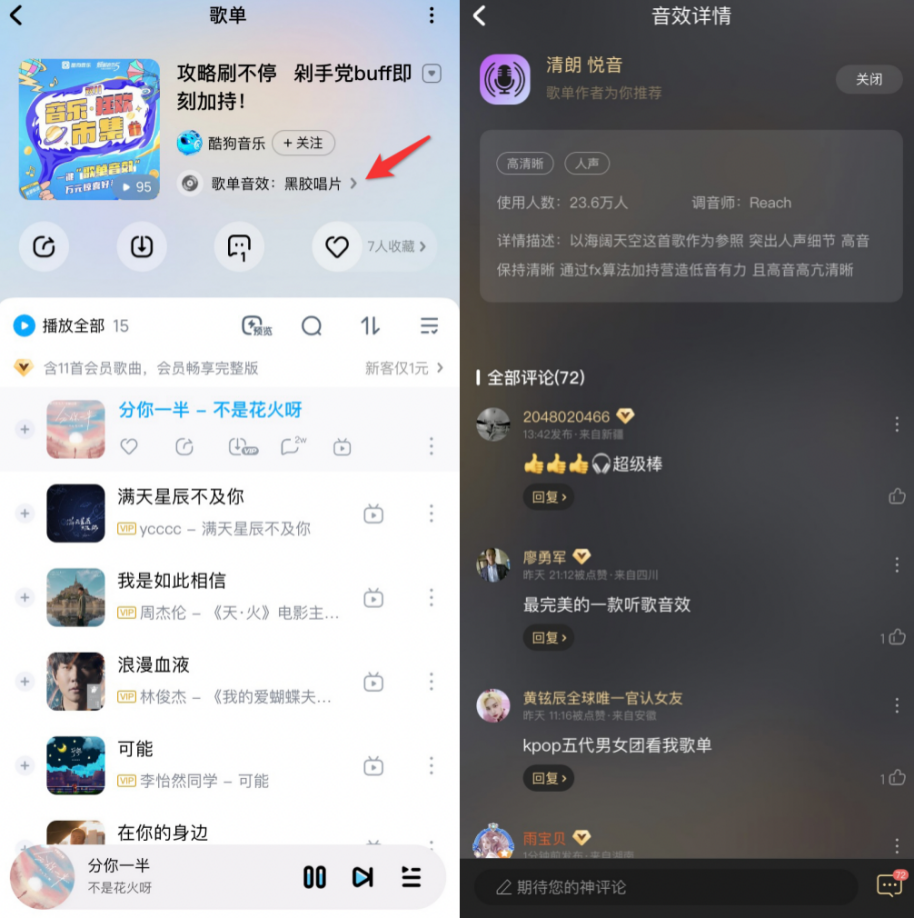 据《音效行业白皮书报告》显示, 在国内在线音乐用户中,89%的人经常听音乐时使用音效,音效不仅让用户获得“更好听”的体验,也让音乐作品更具生命力和感染力。如此次双11活动,酷狗重点向大家推荐的“歌单音效”功能,歌单作者在创建歌单时,可根据内容搭配特定的音效,使歌单歌曲在听感方面更具特色。