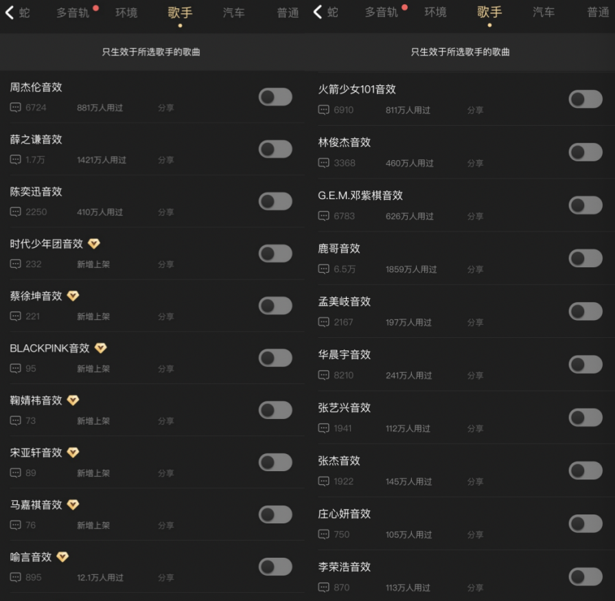 另外,酷狗蝰蛇音效此前还针对不同歌手推出专属的“歌手音效”,像周杰伦音效、薛之谦音效、时代少年团音效、蔡徐坤音效。当你在收听周董歌单时,可以通过“歌单音效”功能,为你歌单中的全部歌曲加入“周杰伦音效”。当使用该音效收听时,你会发现音效拉近音源的同时增强歌曲韵律,让你仿佛置身在舞台中央,随时随地都能听到周董的演唱会。但需要注意的是,【歌手音效】只生效于歌手自身的歌曲,并不适用于其他歌手歌曲。