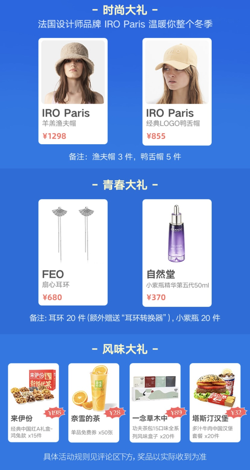 据悉,活动即日起至11月30日结束,现在只需要登录酷狗音乐app,搜索“双十一”,进入专题收听指定的主题音效歌单,并在评论区分享收听感受和购物趣事,即有机会把IRO Paris羊羔渔夫帽、FEO扇心耳环、自然堂小紫瓶精华、来伊份零食礼盒、奈雪的茶饮品券等大礼抱回家~