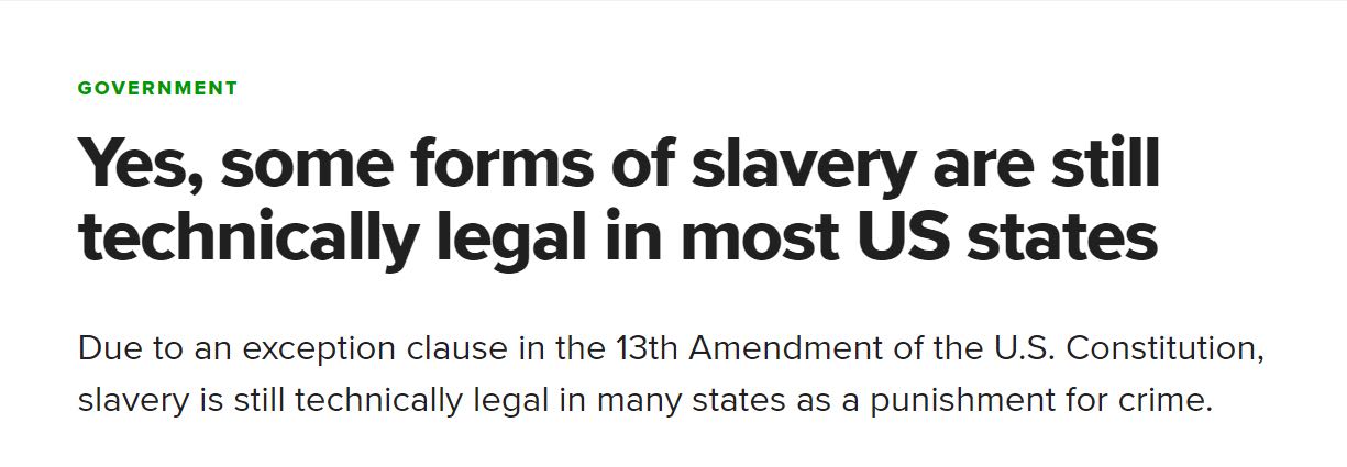 1865年,美国在宪法中废止了奴隶制度,即奴隶属于奴隶主合法财产的制度,但是157年之后的今天,宪法仍然对罪犯沦为奴隶留下了漏洞。这就使得在美国大部分州,奴隶制作为对犯罪的惩罚仍然是合法的。在2022年的中期选举中,阿拉巴马州、田纳西州、俄勒冈州、佛蒙特州和路易斯安那州这五个州投票决定是否从各州宪法中删除这一措辞,争取全面废止奴隶制。
