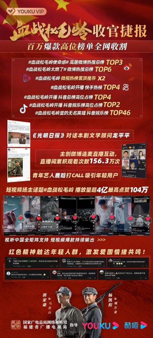 《血战松毛岭》以长征前红军第五次反“围剿”在福建的最后一战为叙事核心,讲述了余光明、朱音、马青山、项万金、李光祖、石红霞、李革命等基层年轻红军战士坚定革命信仰,并为此奋斗献身的热血故事。凭借紧凑扎实的剧情内容、有血有肉的人物群像、逼真震撼的战斗场面,该剧获得观众的广泛好评,一经播出就登上优酷平台上新榜榜首,主话题词微博阅读量突破5000万,#血战松毛岭使命感#等多个话题词条登上微博热搜榜Top3、快手总榜Top4、抖音娱乐榜Top2,其短视频播放量超4亿,最高点赞量达到104万。