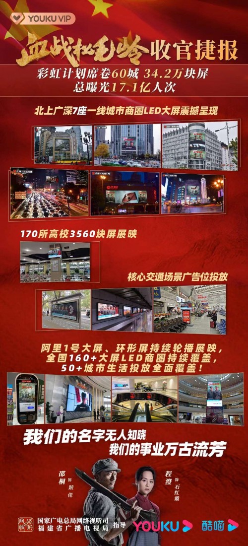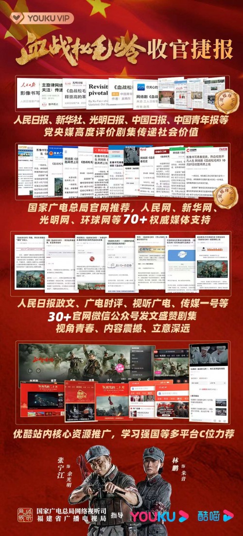 此外,《血战松毛岭》还在优酷“彩虹计划”的支持下于全国60城市的34.2万大屏实现落地,并在170所高校的3560块大屏,以及阿里1号大屏、环形屏和全国160+大屏LED商圈实现了全方位覆盖。在播出过程中,该剧更得到《人民日报》、新华社、《光明日报》等多家中央级主流媒体的肯定。此外,该剧也用口碑和热度展现出革命历史题材网络剧在传递红色精神、点亮时代人心,尤其是激励年轻一代等方面的强大力量。