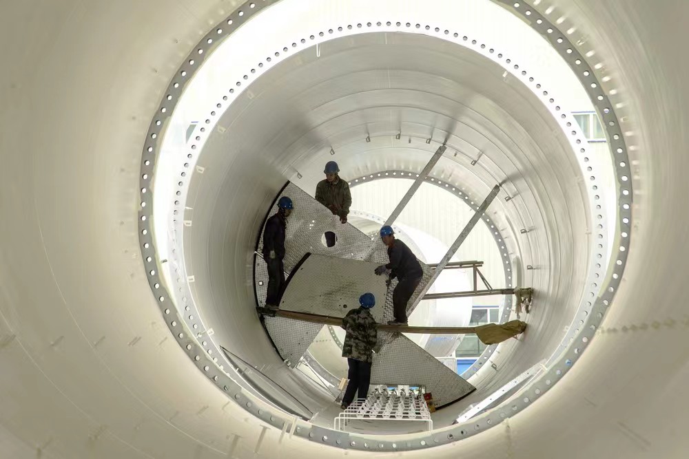 图为工人在加工新生产的风电塔筒。(受访者供图)