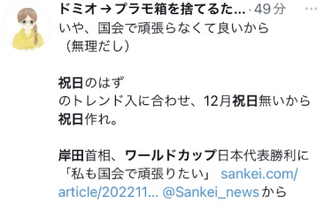 有网民评论称:“岸田你也不用再国会努力(反正没戏),配合‘本来应放假’上推特热搜,给我在12月里加假日,本来12月就没有。”
