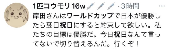 也有人称:“希望岸田能够约定,如果日本世界杯夺冠,第二天放假。我们的目标是夺冠。别再说什么今天放假了,换个思维。冲啊!”