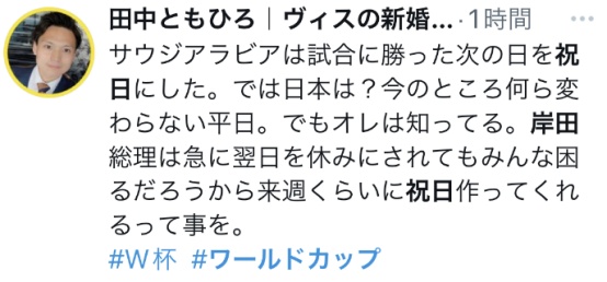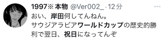 有人喊话岸田:“喂,岸田在搞什么。沙特在世界杯上的取得历史性胜利后第二天可放假了啊。”