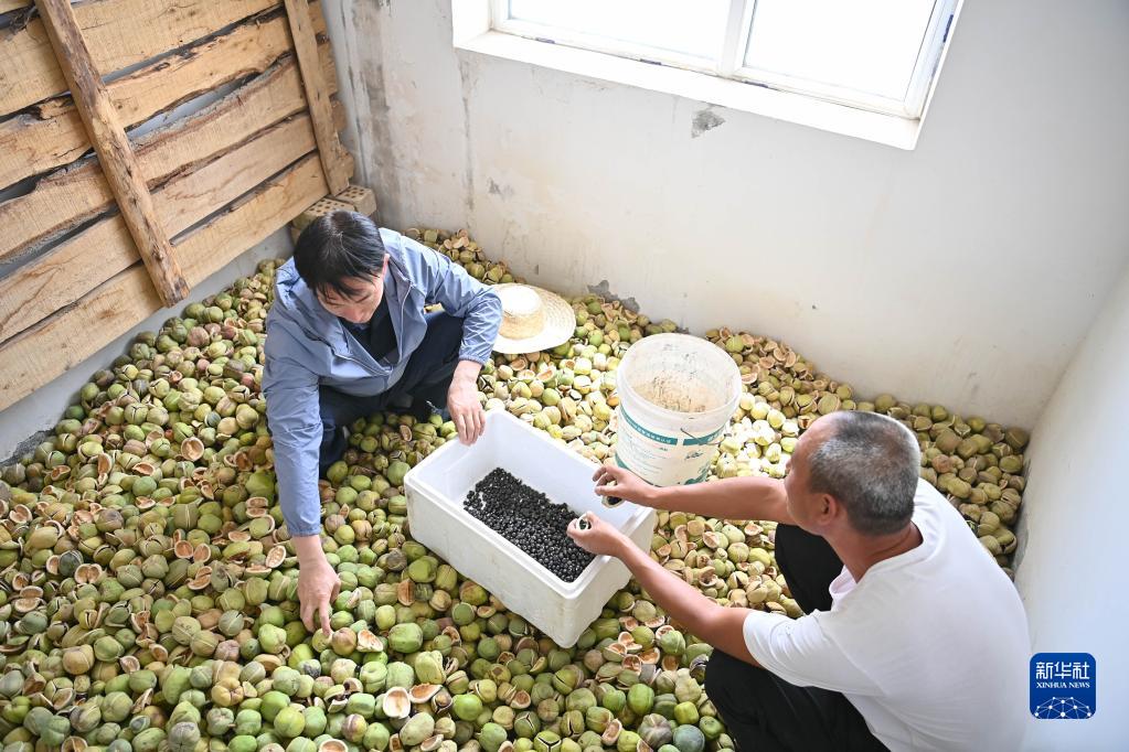 在新疆且末县,张选忠(左)、田来群在沙漠里一处水泵仓库中将采摘好的文冠果去壳剥籽(2022年7月4日摄)。新华社记者李响摄