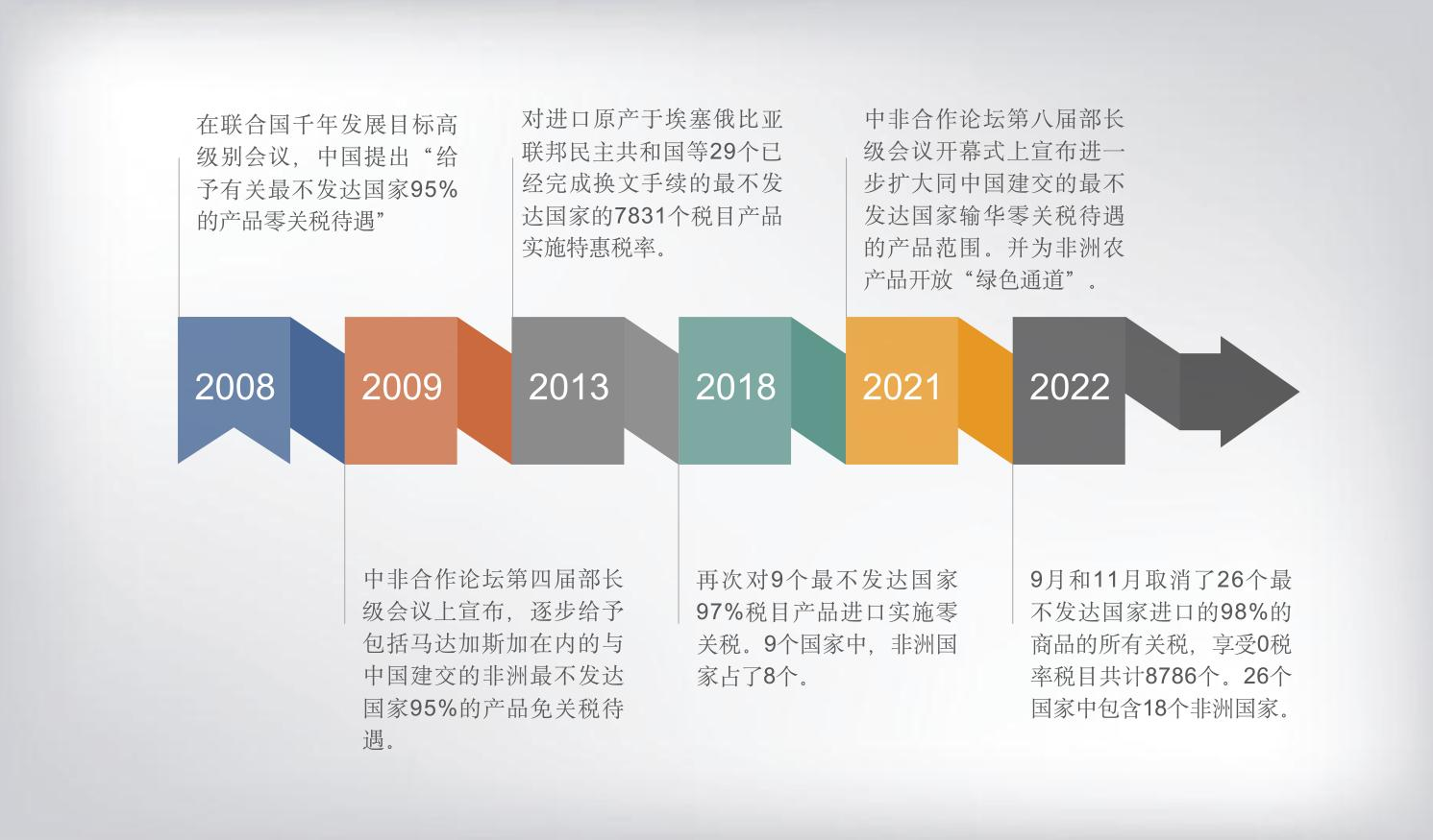 中国一直在践行国际社会对最不发达国家发展肩负的责任,帮助最不发达国家增加对中国的出口。自提出对最不发达国家实行优惠税率以来,一直致力于扩大最不发达国家输华零关税待遇产品范围,积极推动与相关国家签署文件。结合非洲的自身特点,推动了构建高水平中非命运共同体,进一步同最不发达国家共享市场机遇。这样的政策是中非合作携手摆脱贫困的落地行动,践行了“构建人类命运共同体”的倡议。