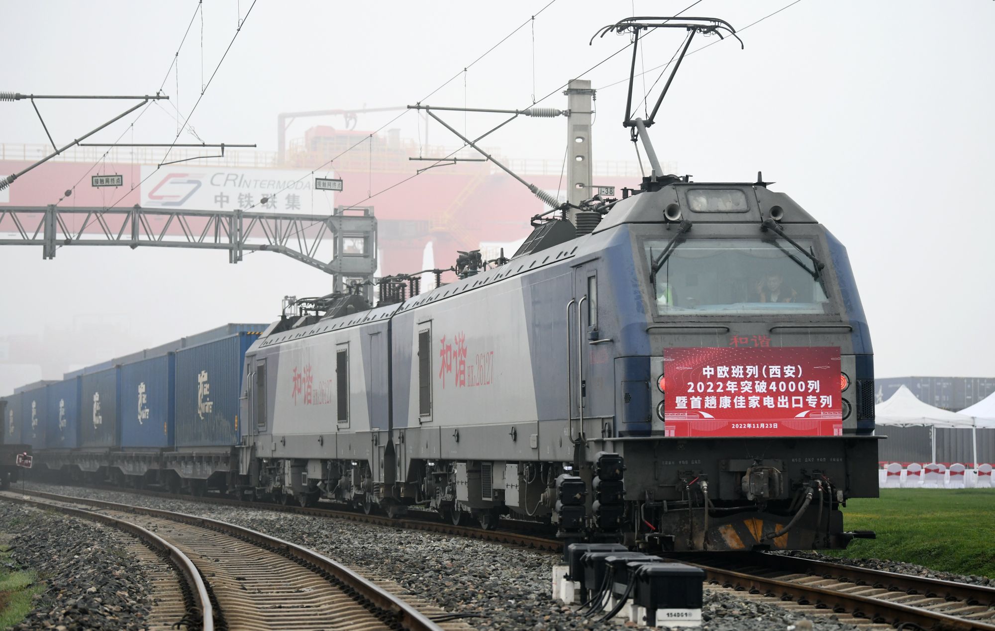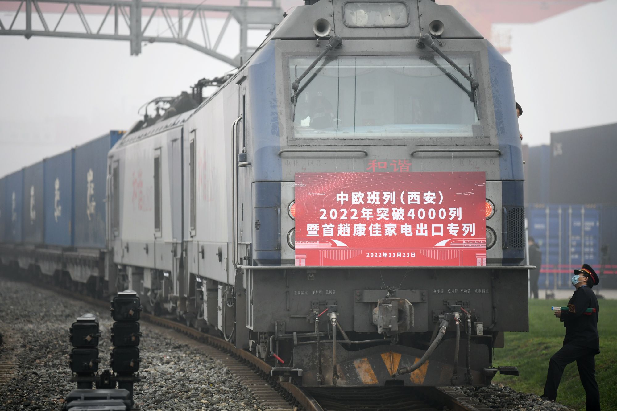 ↑11月23日,满载家电产品的中欧班列从西安国际港站驶出。