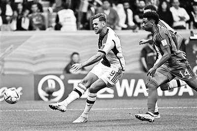 德国队球员菲尔克鲁格在比赛中射门得分