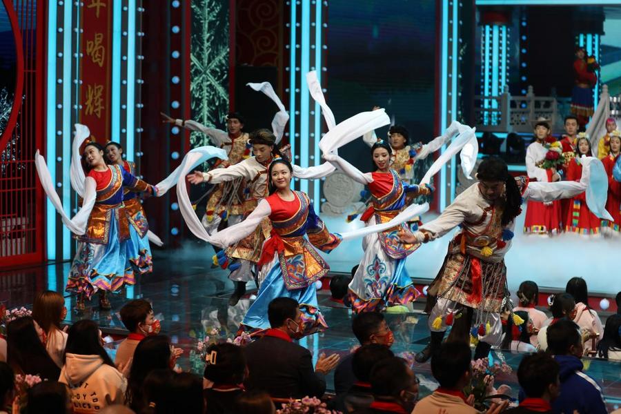 在《辽视春晚》的舞台上,还有展现团结奋进奔向新征程、新时代的精彩段落。在歌舞创意融合类节目《好歌唱响新时代》中,身着五十六个民族服饰的舞者齐聚,在著名女高音歌唱家王丽达嘹亮的歌声中翩翩起舞。五十六个民族舞种和谐统一、相映成趣,传递出民族和谐、国泰民安的幸福感,给观众带来了视觉和听觉的双重享受。