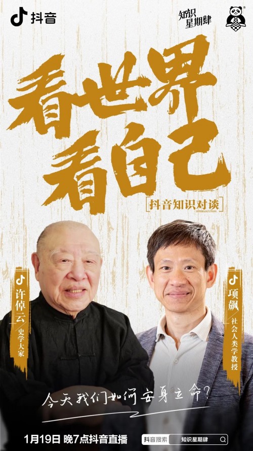 新的一年,我们如何与自己相处?如何和世界相处?1月19日,腊月二十八晚19:00,史学大家许倬云与社会人类学教授项飙做客@抖音知识《知识星期肆》节目,围绕“视角、竞争与差异”话题进行对话,带领网友跳出竞争思维,看世界、看自己,找到在这个时代的安身立命之道,当晚看播量超过3000万人次。