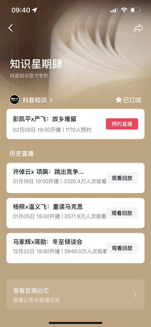 据介绍,《知识星期肆》是由抖音知识策划的一档系列化知识栏目,定期邀请知识文化领域大咖,携其最新观察和著作做客栏目,和大家一起畅聊时代议题、开拓知识视野。本期对话是该节目的第三期,在前两期节目中,有作家马家辉对话蒋勋,作家杨照对话温义飞,分别以“我们如何对抗孤独”“重读马克思”为主题展开讨论。用户可通过@抖音知识账号下的直播专栏进行观看。