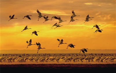 江西鄱阳湖国际重要湿地拍摄到的鹤群。