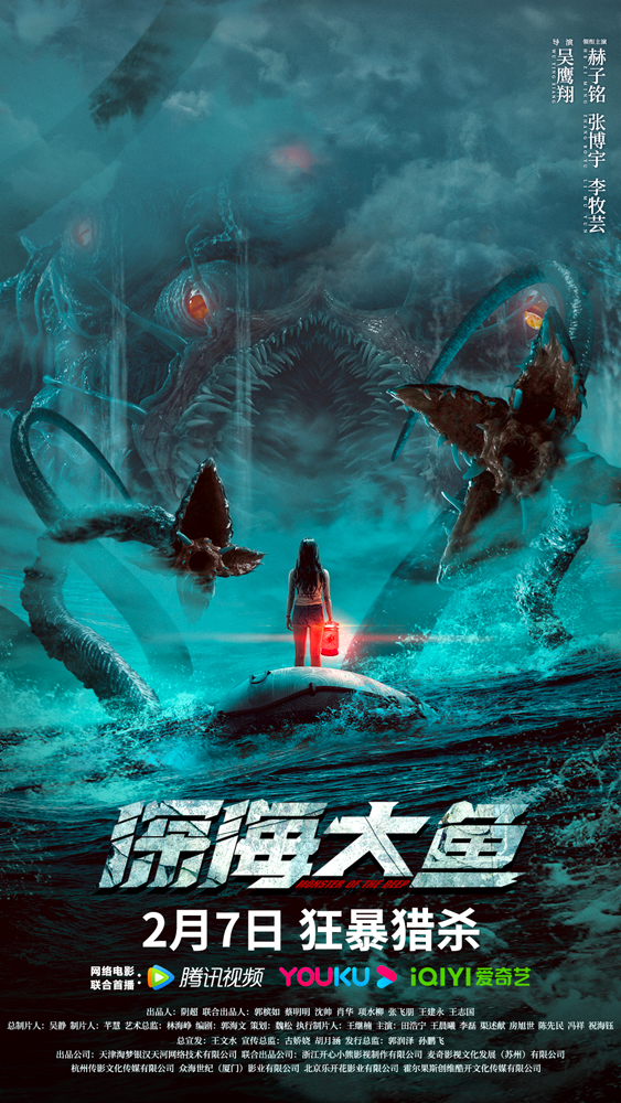据了解,《深海大鱼》由天津淘梦银汉天河网络技术有限公司出品,浙江开心小熊影视制作有限公司、麦奇影视文化发展(苏州)有限公司、杭州传影文化传媒有限公司、众海世纪(厦门)影业有限公司、北京乐开花影业有限公司、霍尔果斯创维酷开文化传媒有限公司联合出品,2月7日即将全网上线,深海怪兽、震撼视效即将引来开年第一狂暴!