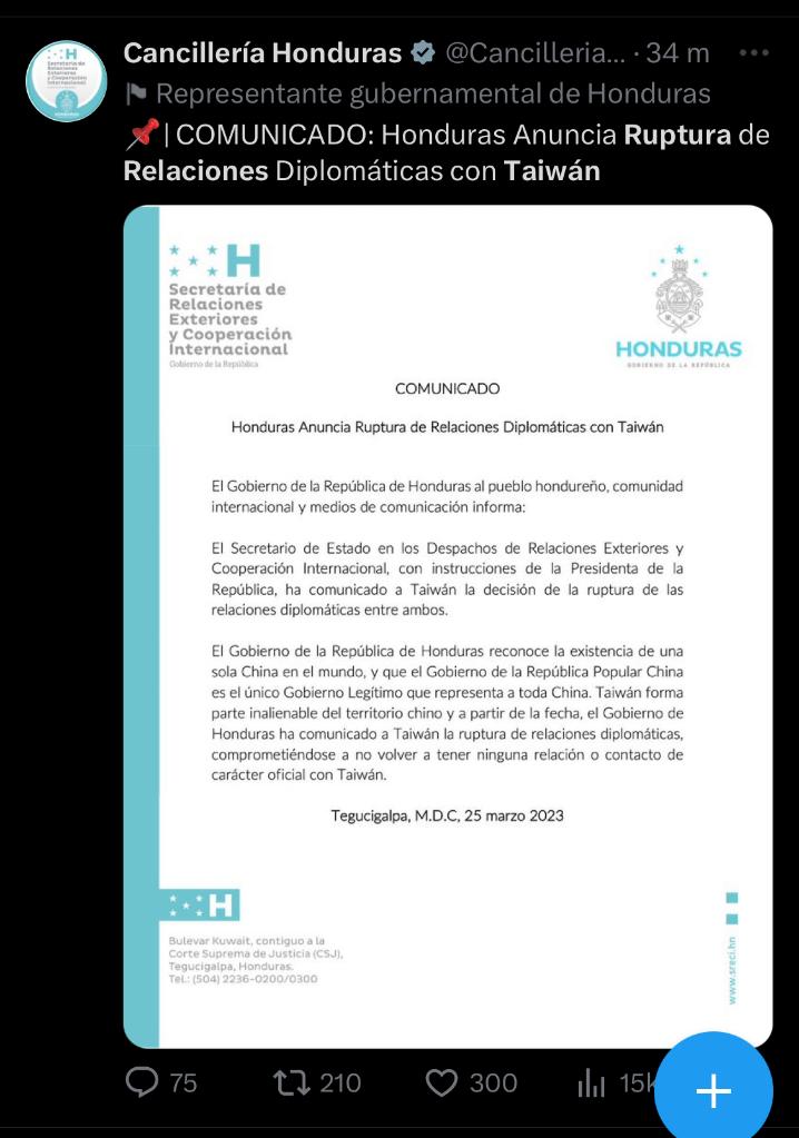 洪都拉斯外交部当地时间25日下午发布声明,宣布与台湾断绝所谓“外交关系”。北京时间3月26日,中国和洪都拉斯建交。