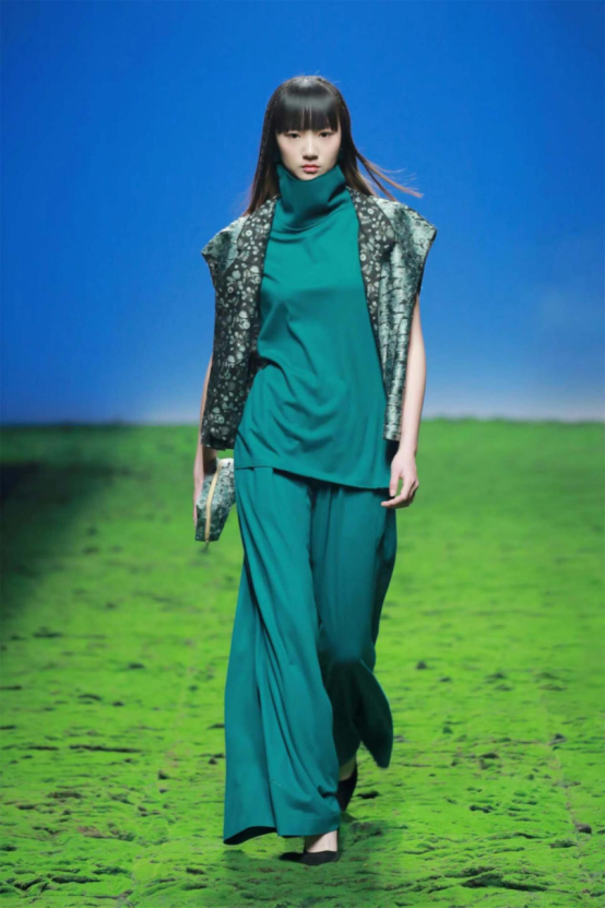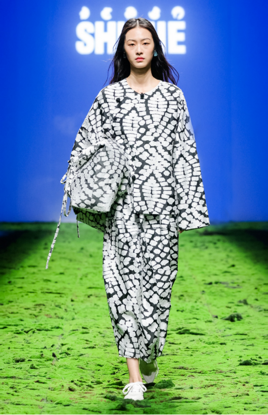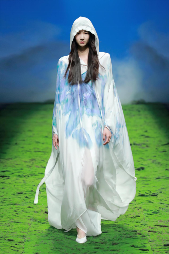 中国传统文化讲究天人合一、师法自然,通过认识自然,发现自然,合理运用材料与天地契合。随着如今的碳达峰、碳中和的提出,服装设计师们更多开始将目光转向可持续设计实践。而SHIJIE一直以来秉承东方哲学的文化理念,秉持以人为本的观念,充分考虑人、服装、环境之间的和谐关系,塑造和谐的可持续发展观。“自然之子”系列全部采用丝、棉、麻等天然纤维以及香云纱、宋锦等非遗可持续面料及工艺,与设计师独有的水墨手绘艺术相融,赋予服装“当代感”和“优雅感”。