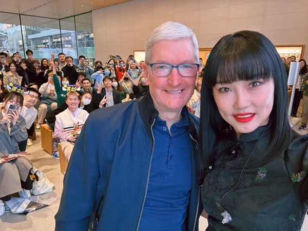 一袭黑色中式连衣裙造型,黄龄深情款款地演唱了两首代表作《Hello》与《醉》。余音缭绕中,苹果全球CEO蒂姆·库克先生(Tim Cook),特意来到台上向黄龄表示感谢并合影留念。