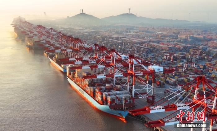 资料图:4月1日,上海,桥吊林立的上海港洋山深水港码头,多艘超大型集装箱货船正在进行集装箱装卸作业,码头作业繁忙有序。