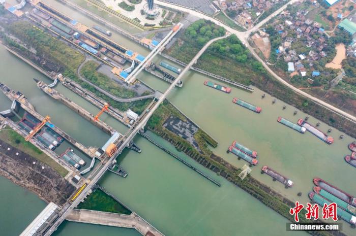 资料图:4月2日,航拍广西梧州长洲水利枢纽,船只有序通过船闸,各类物资运输通畅,一派繁忙景象。