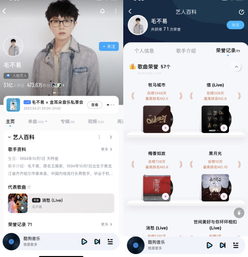 从2017年《明日之子》出道至今,毛不易一步一个脚印,时刻不忘初心,为广大歌迷带来了《平凡的一天》、《看得最远的地方》等一首首感人肺腑、启迪人生的经典音乐。在酷狗,有3.1亿人听过他的音乐,他的数十首歌曲长期稳居在酷狗TOP500,如歌曲《消愁》在榜1391天,《像我这样的人》在榜1423天,还有他的专辑《月光、背影与海》曾获得酷狗2022年度十大热门华语专辑。