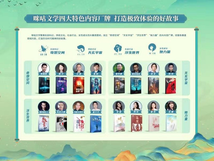 咪咕文学作为中国移动咪咕旗下以强大的科技创新力赋能作者和行业的文化服务平台,聚焦科技科幻、传统文化、社会行业、女性成长四大垂类题材,创立“奇想空间”“天玄宇宙”“浮生世界”“她力量”四大特色内容厂牌,挖掘各垂类领域内容,打造符合时代精神的好作品。