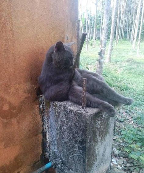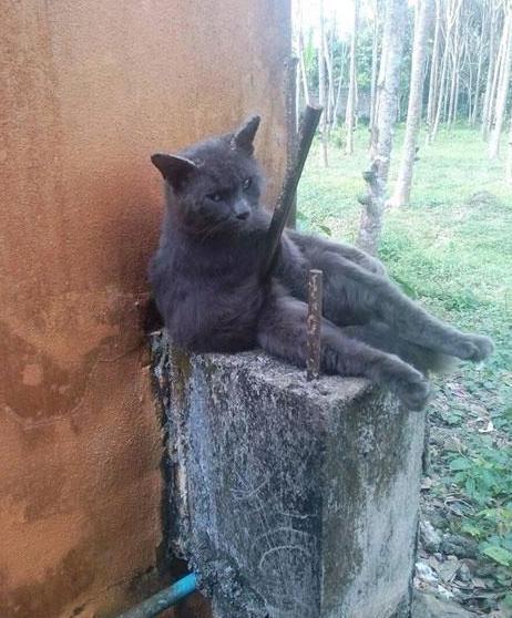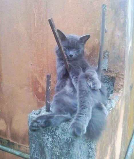 不过当女子正想去救它时,再仔细一看顿时愣住了,因为这猫咪并不是被钢筋刺穿,只不过是卡在了两个钢筋之间,由于错位看上去就像是被刺了,而再看看猫咪的神情和姿态,女子是笑不出来了。