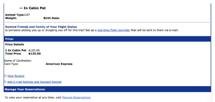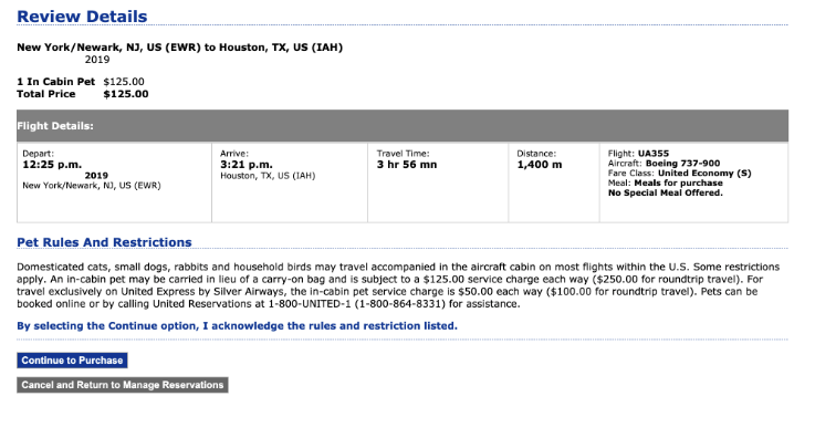 接下来的页面会给出宠物费,基本上美国几家大的航司境内宠物费都是125美元。点Continue to Purchase进入下一页。