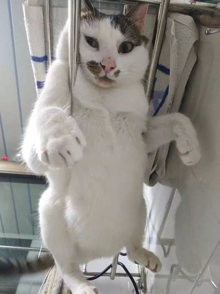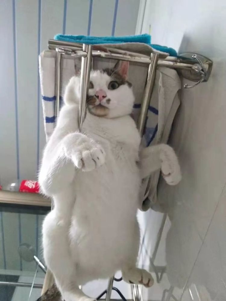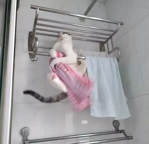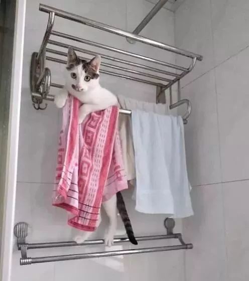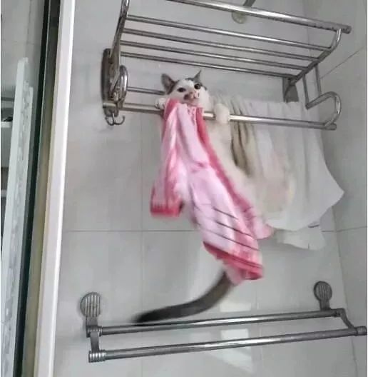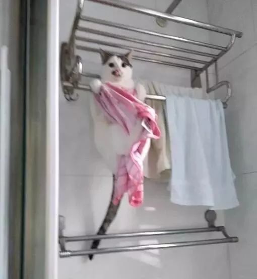 铲屎官@稻草鱼家的猫有一个特殊的“爱好”,喜欢跳到浴巾架上挂着~