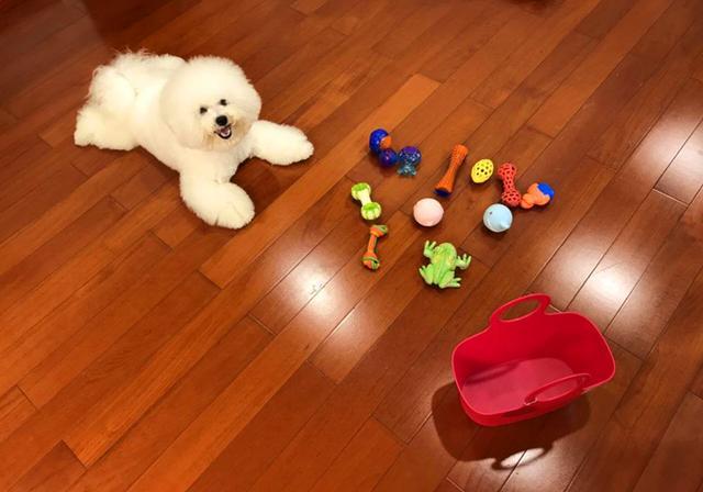 4.教狗狗把玩具收起来:铲屎官可以利用这段休息时间来让狗狗学会收拾玩具,当它做出正确的行动后,一定要有所奖励,让狗狗知道这是一件好事。