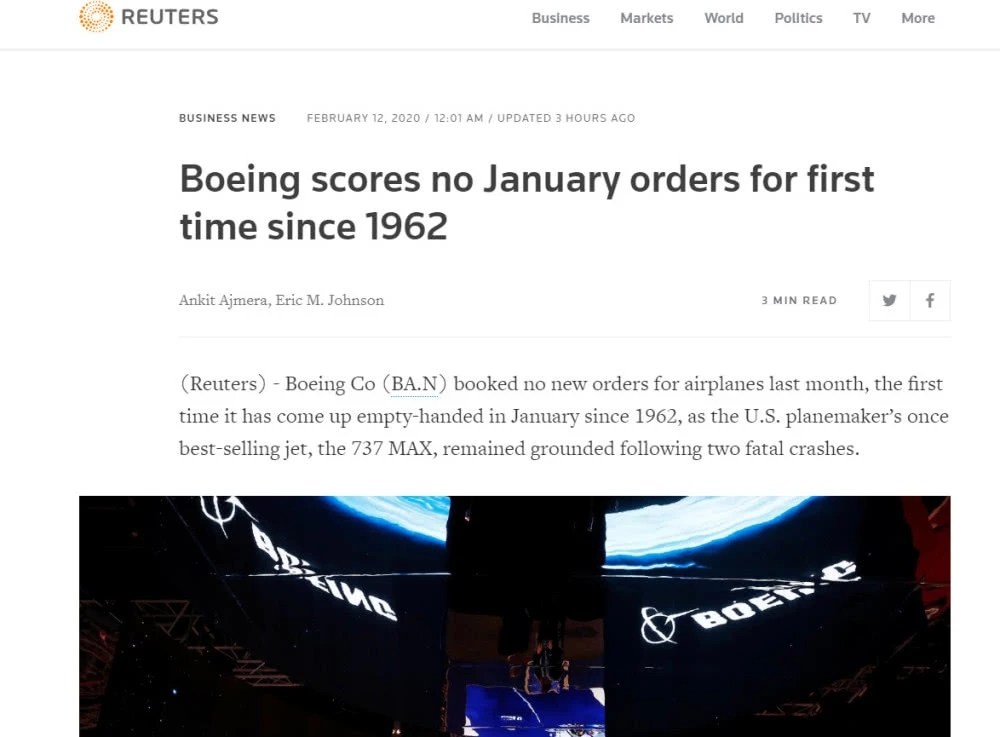 波音公司于本周二表示,2020年1月份未获得新的飞机订单,波音777和波音777X的净订单为零,波音737和737MAX净订单也为零,为1962年以来首次。