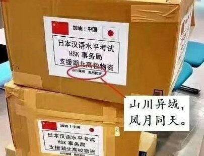 近日,日本接连向我们捐赠了抗疫的医疗器材。在这些捐赠物资的包装箱外面,都贴了写有捐赠单位的标签,当然,标签上还有鼓舞我们抗击疫情斗志的口号: