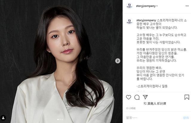2月11日,韩国女艺人高秀贞的所属娱乐经纪公司在社交媒体平台INS上发布消息称她已离开人世,公司在悼念文里写道:"珍贵的演员高秀贞化身为天上的一颗星星了,她比任何人都还要纯洁美丽,是散发着清新光芒的人。你看着我们露出的灿烂微笑,最美丽的青春,如你清澈内心般的自然演技,我们都会永远记得的,我们永远的演员,希望你前往的那个地方不再有病痛,安息吧。"