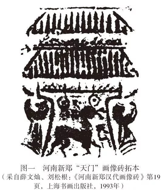 目前所见最早的一例题刻为天门的图像见于河南新郑西汉晚期到东汉早期的一方画像空心砖上。其上刻划一重檐单阙,阙体上有一对璧形图案,阙前有一马,两旁各有一人。在阙体右下部即马的前方刻有两个字,虽有些模糊,但著录者将其释读为“天门”(图一)。笔者认为释读是准确的。题刻为天门的图像以往只发现于四川、重庆地区的东汉晚期墓葬中,该画像砖出土于河南地区,且其时代比四川、重庆地区的天门图像要早得多,具有重要意义。不过目前所见的题刻为天门的画像资料,还是以四川、重庆地区为主。