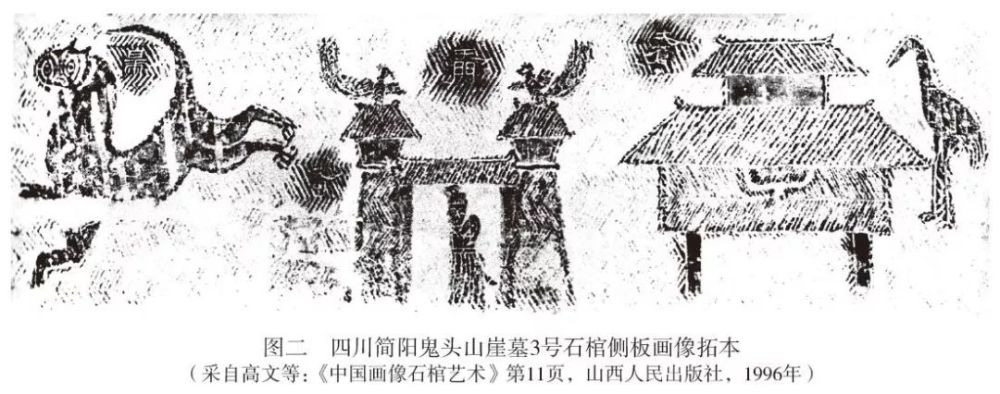 四川简阳鬼头山东汉崖墓出土3号石棺一侧正中刻有双阙,阙顶各有凤鸟一只,阙上有“天门”题刻。阙间有一人,题刻“大司”,司守天门。阙两旁有带题刻的白虎和“大仓”图像(图二)。汉画像中多见“上食天仓”“饮食就天仓”和“食大仓”题刻。虽然对“大仓”的性质还有争议,但从图像组合看,此处的“大仓”应即“天仓”无疑,与作为四象之一的白虎一样为天界物。它和天门组合在一起,意义十分显明。