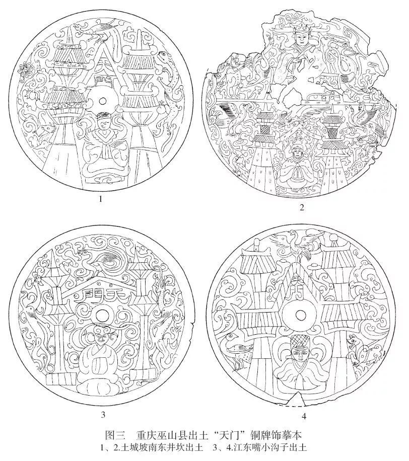 重庆巫山县出土不少东汉晚期(有些可能晚到晋)的鎏金铜牌饰,其上图像主要为双阙,阙上有凤鸟,阙中心有一璧形物,阙间有神人端坐,应为门阙的司守,阙旁有神兽,许多牌饰上自题为“天门”(图三)。有的在双阙上部刻划西王母,将西王母与天门紧密地结合在一起(见图三,2)。有学者根据铜牌饰出土位置认为其应是装在木棺前端正中的饰件。这些双阙图像中的璧形物十分突出,有学者认为只是棺钉的痕迹,然而许多非棺饰的天门图像中有更加突出的璧形物(详后),显然是有意为之。