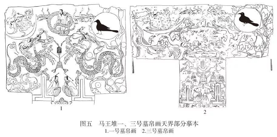 据前所述,天界事物的出现是认定天门图像的重要标志。与天界事物关联的双阙图像最早见于西汉前期的马王堆一、三号墓所出帛画之上。两幅帛画的上部描绘了天界的景象,其中绘有日月星象、神人神兽。而这个天界的入口处夹立着一对柱状物,其中有两神人作迎接状(图五)。学界较为一致地认定这对柱状物为双阙,为天门、天阙的表现。笔者认为这种认识是正确的。