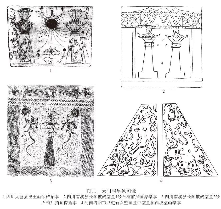 四川大邑县出土的一方汉晋时期画像砖上,双阙之间有一鸟状的日或月,其上二星对置(或为天门二星或阙丘二星),阙两侧有伏羲、女娲(图六,1)。这里的双阙为日月所出入,自然当是天门。《晋书·天文志》云:“角二星为天关,其间天门也,其内天庭也。故黄道经其中,七曜之所行也”。“七曜”即日月和五星。四川南溪县长顺坡砖室墓1号石棺前挡上双阙画像中间亦有星象(图六,2),2号石棺后挡刻划一阙,两旁为伏羲、女娲手托日、月,也应为天门(图六,3)。河南洛阳市尹屯新莽壁画墓墓顶描绘着一幅颇为完整的天象图,中室墓顶西坡在白虎、织女、牵牛之上的云气中绘有双阙(图六,4)。冯时先生认为应该是阙丘二星的表现,以象天阙。此认识显然是正确的。