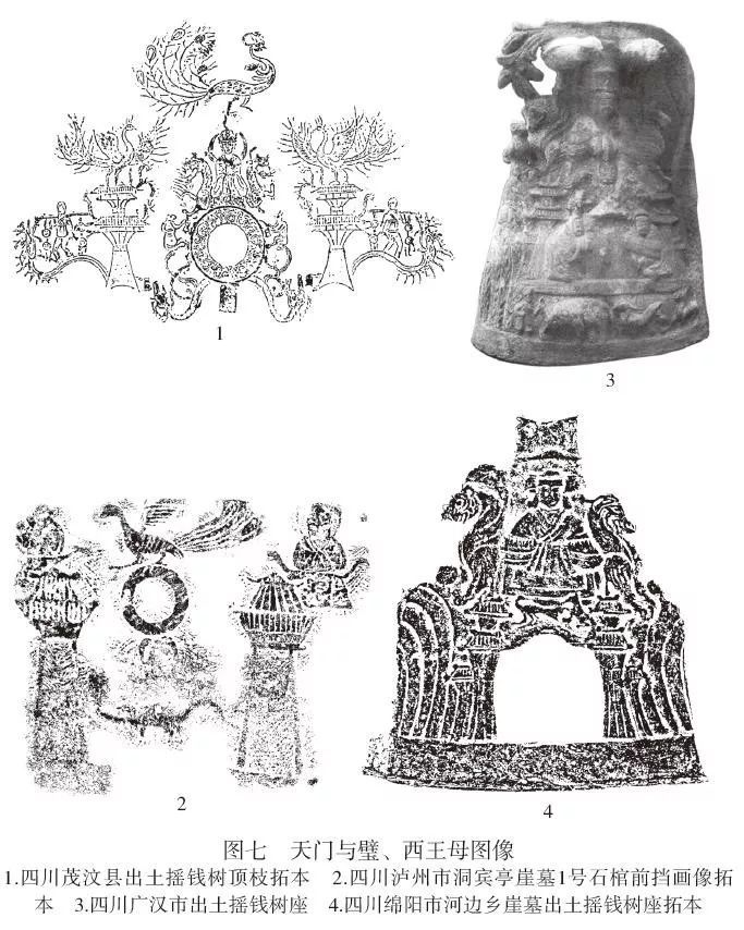 出自四川茂汶县的一件摇钱树顶枝图像上有双阙,双阙上各有凤鸟一只,阙间有一璧形物,其上端坐西王母,西王母上又有一只凤鸟(图七,1)。其图像因素与组合和巫山天门铜牌饰如出一辙,当为天门无疑。四川泸州市洞宾亭崖墓1号石棺前挡上也有一幅类似图像,双阙中有一璧形物,璧上有一只凤鸟,璧下似有端坐神人,两阙上各有一个端坐神人并有头光,一般认为是受佛像影响的西王母和东王公形象,这里的双阙也应为天门( 图七, 2 ) 。四川广汉市出土一件山形彩绘摇钱树座上,双阙中有二人作迎接状,阙上为端坐的西王母(图七,3)。绵阳市河边乡东汉崖墓出土摇钱树座与前者类似,山形树座上刻划双阙,其上有西王母和凤鸟(图七,4)。这些无疑皆为天门之表现。
