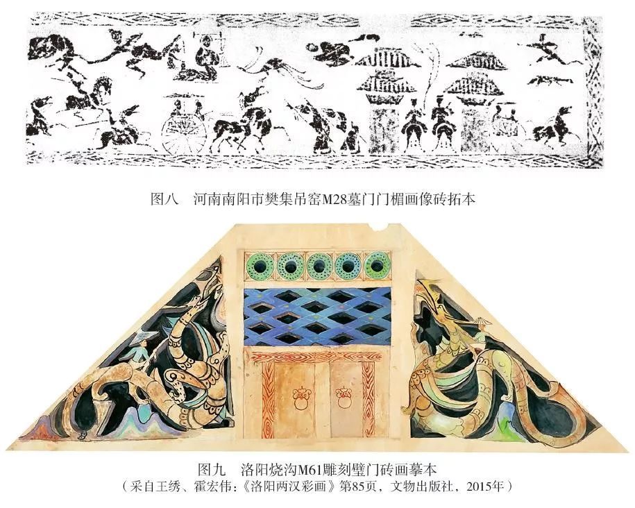 另外,洛阳烧沟61号西汉壁画墓后室前壁门梁上用彩绘镂雕砖镶嵌着一幅画面,中心是有铺首的双扇大门,一扇微开,门上方横列五璧,门两侧各有一人骑龙面向大门(图九)。郭沫若先生认为此处的大门即是天门、阊阖,门上横列的五璧象征着五曜,即水、火、木、金、土五星,两侧骑龙之人为一男一女正好与墓主夫妇对应,此图即象征着墓主夫妇正乘龙升往天门。从大门的位置及两侧有骑龙人物升向大门的场景来看,郭先生认为此大门为天门的观点值得注意。不过其两侧的乘龙之人为羽人,未必是墓主夫妇;其上的五璧也未必为五曜,因为天门与璧的组合方式在前述许多图像中可见到,其与天门的关系已详述。如果郭先生的认识正确,那就提示我们,汉墓中除了可以用阙,也可以用大门来表现天门。四川、重庆地区画像石、摇钱树座和灯座上可见到一种将半开门与西王母相结合的题材(亦见于陕北地区),其中的门是否天门,由于缺乏可以认定的资料,且这些图像中门的地位往往不及西王母突出,也可能只是西王母居所之门,目前只能存疑。