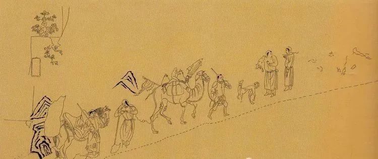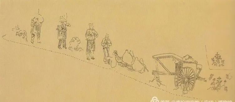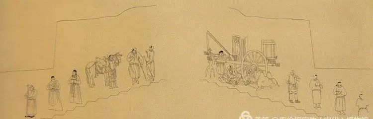 库伦旗奈林稿苏木前勿力布格六号辽墓《归来图》,绘在墓道南壁白灰墙面上,由外向里按墓道斜坡面构图,四个侍从倚杖伫立,两匹跪卧在地的双峰驼似刚从车上卸下,一架高轮车放置在地。