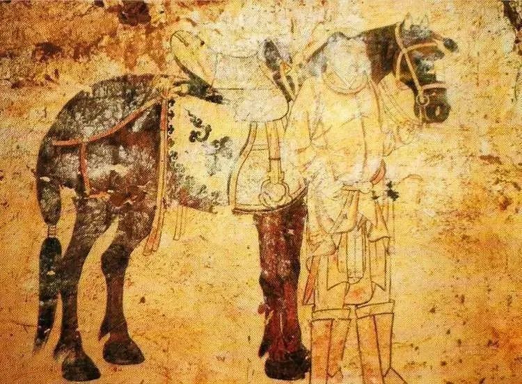 库伦旗奈林稿苏木前勿力布格二号辽墓《出行归来图》,分别绘在墓道两侧白灰墙壁上,由里及外按墓道斜坡面构图。有人物、高车、骆驼、鞍马等。人物有的持权杖面朝墓室,有的牵马伫立,有的伸指拍胸谈论着什么。驭者坐在车辕下,头部上仰,与脖子勾在车辕上的矮个人说话。男士均为髡发,圆领窄袖长袍。有一女似主人,头戴黑色瓜皮帽,帽沿扎浅红色飘带,后系花结,鬓发下垂,怀抱圆形梳妆盒面朝墓室而立。双驼卧在车轮旁,一驼伸颈哀鸣,一驼昂首前视。