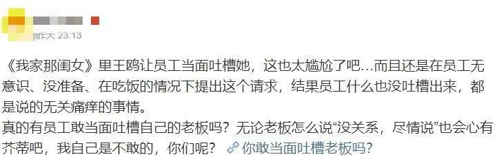 关键在点评环节,王鸥被告知员工真正吐槽的点,其中有一个“容易把气氛带得很正经”,王鸥三两句话又把话题拐到了自己的原生家庭,因为妈妈自小对自己严厉,每每听见她直呼自己大名,身子就瞬间紧绷。