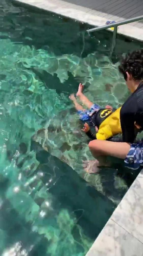 画面中,Lucas把一岁半的小弟弟抱入游泳池,然后非常认真的教Marcus浮水、游泳。