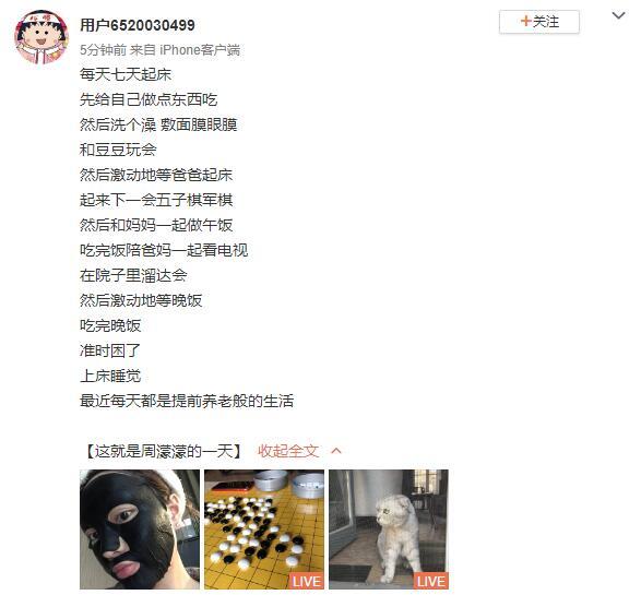 3月7日周扬青在微博分享在家中的生活点滴,她在文中透露自己现在每天七天起床(她应该是打错字了是七点起床),先做东西吃,然后洗澡敷面膜和宠物猫玩,接着等爸爸起床后一起下五子棋,之后和妈妈一起做午饭。饭后陪父母看电视,在院子溜达会儿,就开始激动等待晚饭。晚饭后,准时困了就上床睡觉。