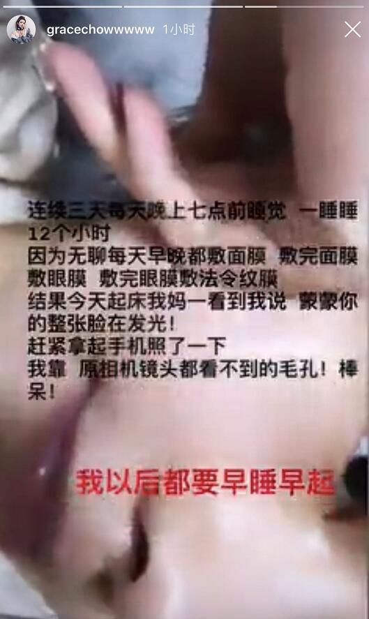 在粉丝发文后的同天早晨,周扬青就晒出了一张写满文字的自拍。称自己已经连续三天每天晚上七点前睡觉,一睡睡12个小时,因为无聊每天早晚都敷面膜,敷完了面膜又敷眼膜,完了又敷法令纹膜。
