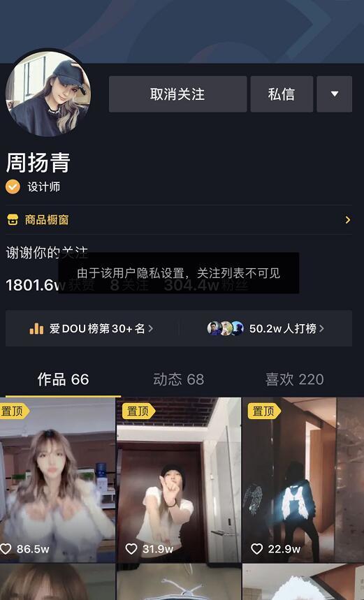 点击进入周扬青的账号,小编想看看她是否与小猪互关,没想到却发现周扬青设置了隐私保护,关注列表不可见。这样的行为难怪会令粉丝担心他们两人的关系了。